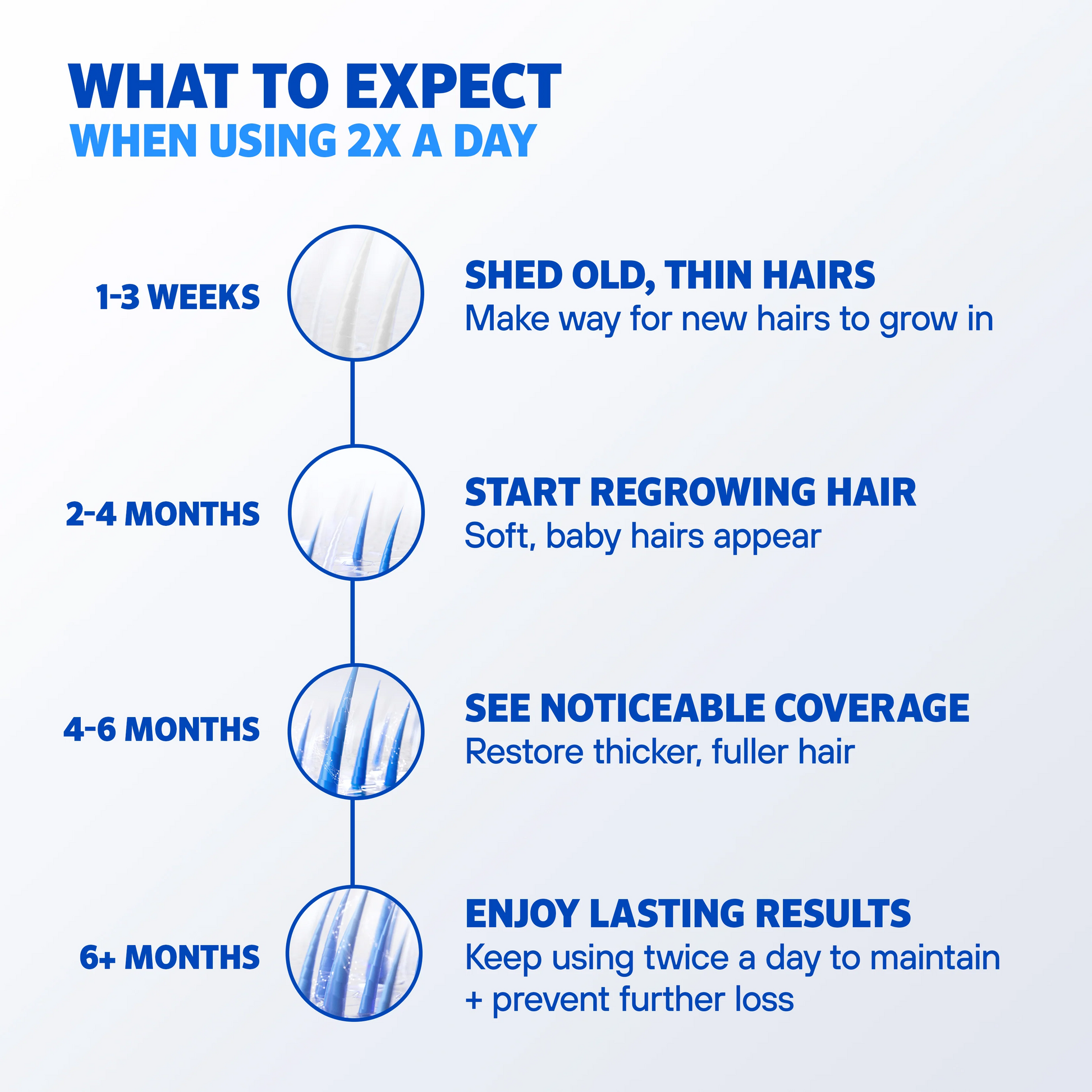 You’ll begin to see results in 3-6 months, and remember to keep using ROGAINE®in order to keep your hair regrowing. Like many good things, patience and perseverance are the key to success using ROGAINE®. SeeHow ROGAINE® Works.